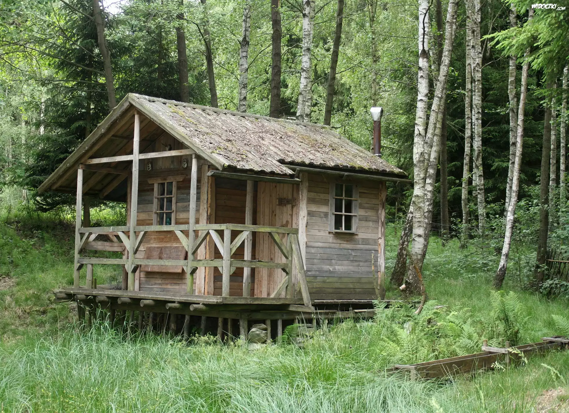 Zdjęcia, Drewniany, Domek, Las, Trawa, Paprocie