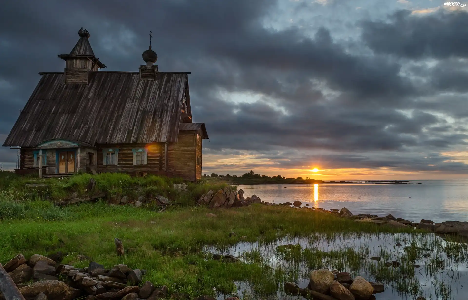 Zdjęcia, Ukraina, Drewniany, Kościół, Jezioro, Trawa, Zachód, Słońca