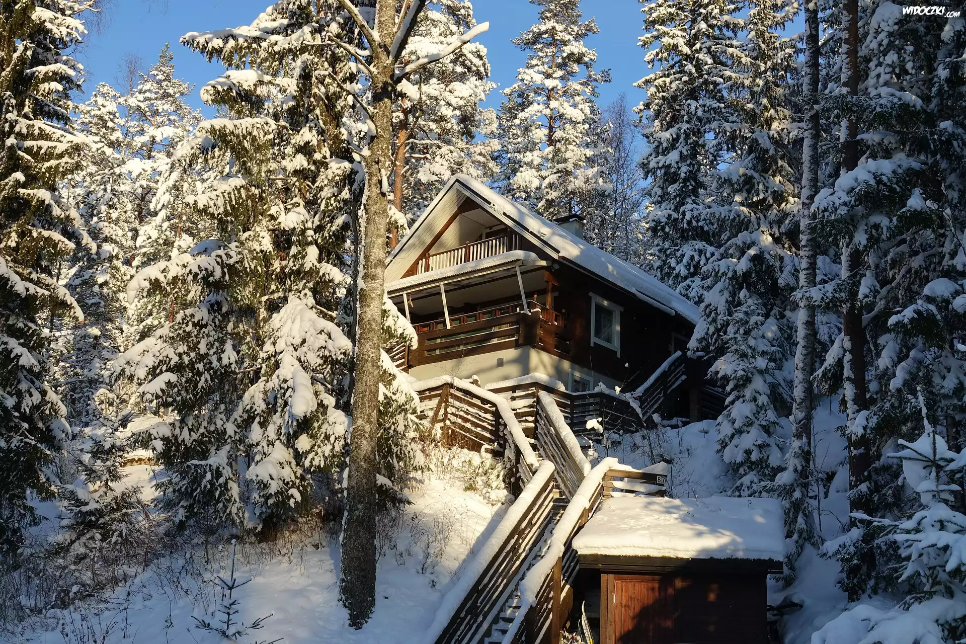 Zdjęcia, Zima, Drewniany, Dom, Drzewa, Śnieg, Słoneczny blask