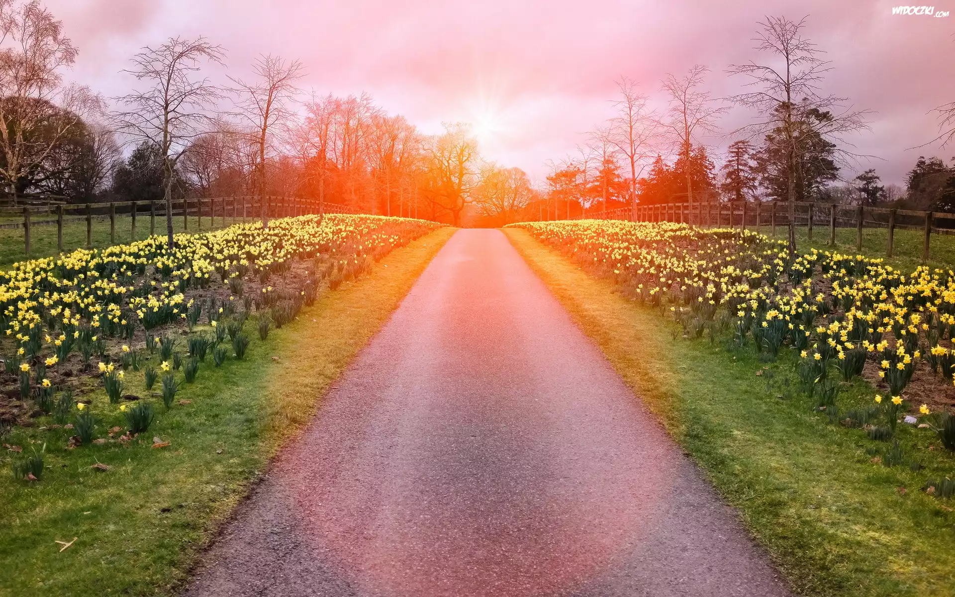 Zdjęcia, Droga, Żonkile, Blask, Drzewa