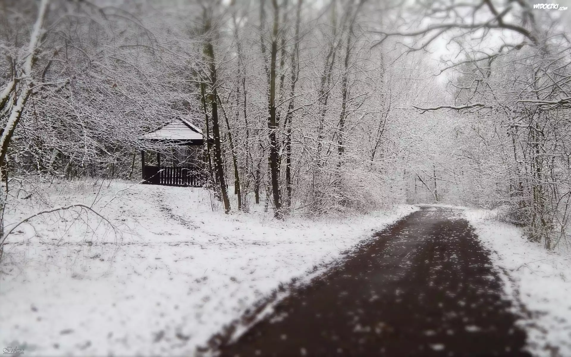 Zdjęcia, Droga, Drzewa, Budka, Śnieg