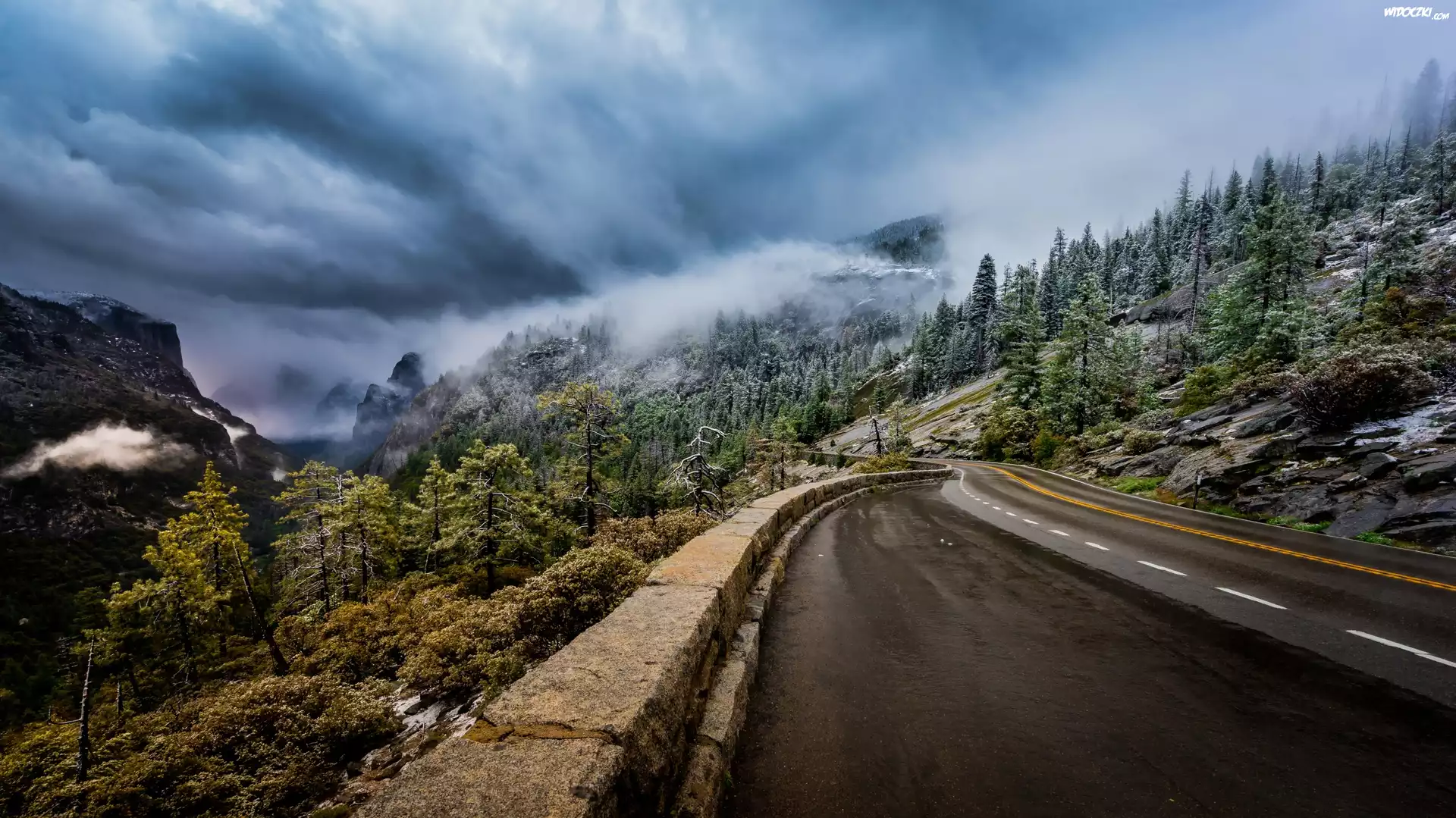 Zdjęcia, Droga, Góry, Mgła, Chmury, Drzewa