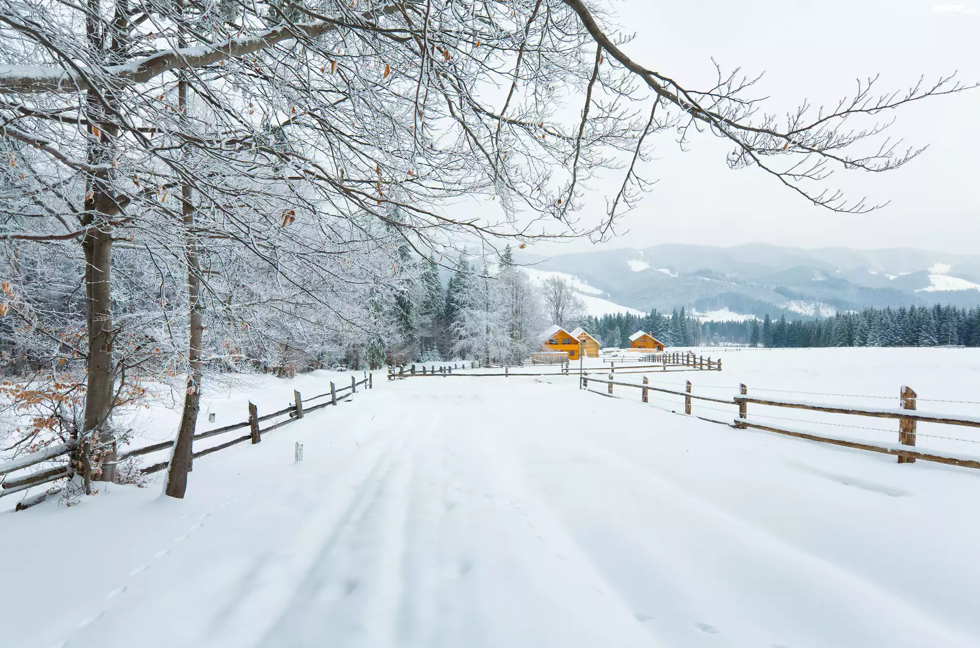 Zdjęcia, Droga, Drzewa, Śnieg, Zima, Domy