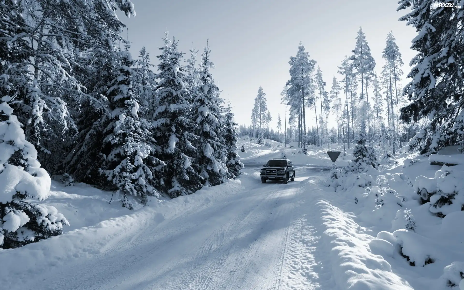 Droga, Auto, Ośnieżone, Drzewa, Las