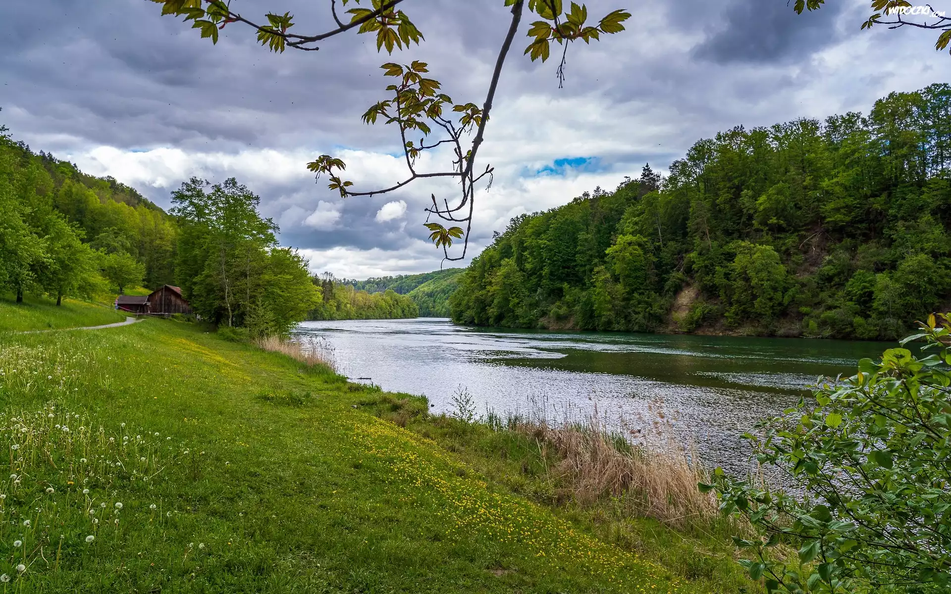 Rzeka Ren, Drzewa, Droga, Szopa, Tossegg, Szwajcaria