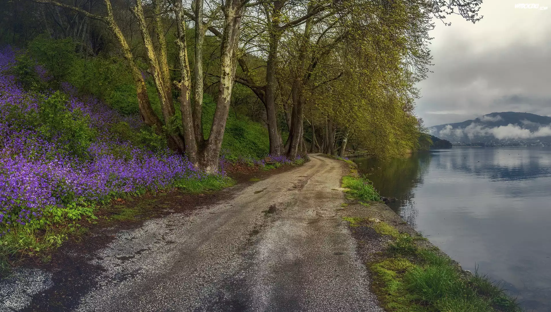Jezioro, Droga, Drzewa, Kwiaty, Wiosna