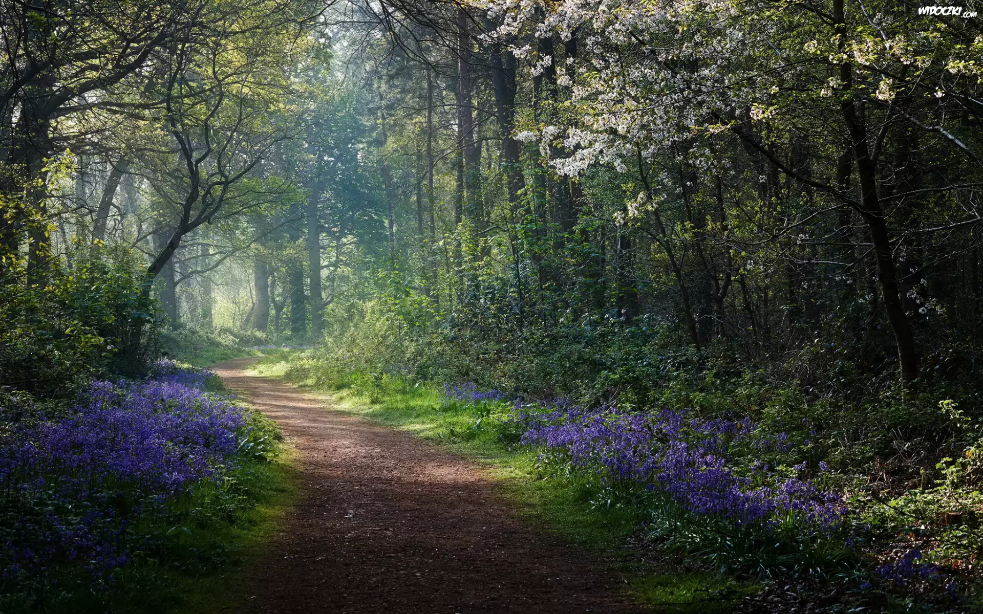 Zdjęcia, Droga, Las, Wiosna, Fioletowe, Kwiaty