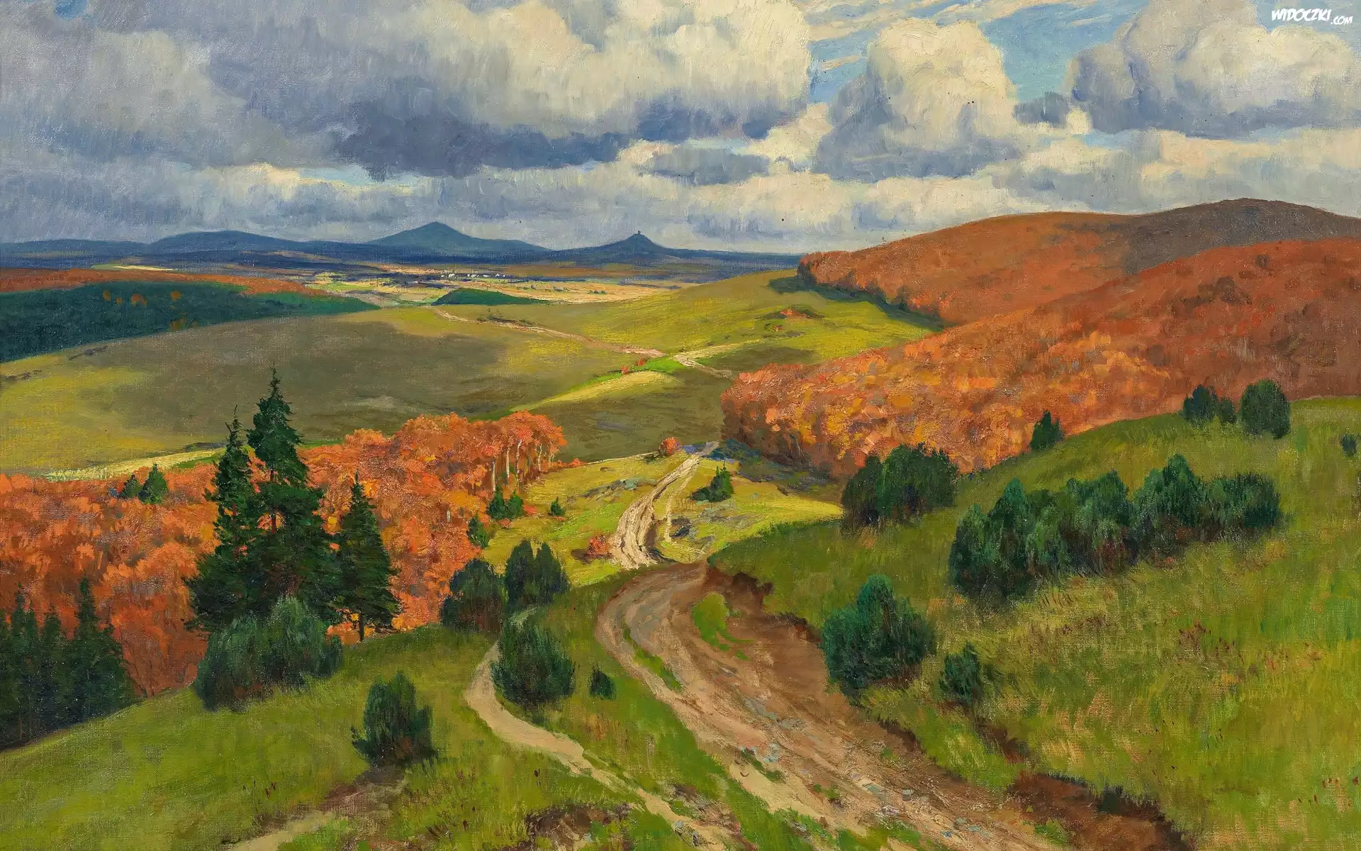 Zdjęcia, Malarstwo, Obraz, Fritz von Wille, Krajobraz, Jesień, Wzgórza, Droga