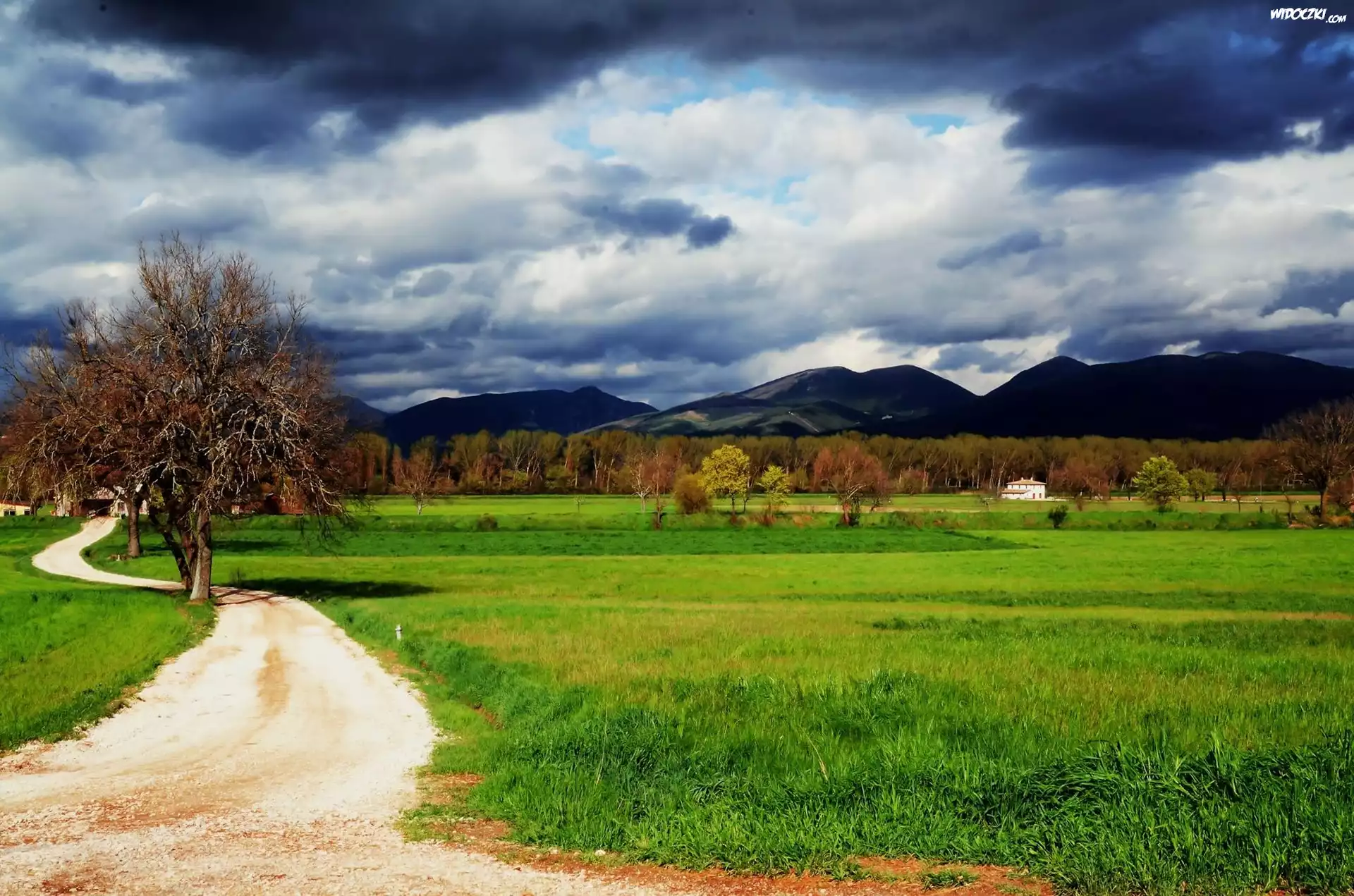 Zdjęcia, Droga, Pole, Drzewa, Góry, Niebo