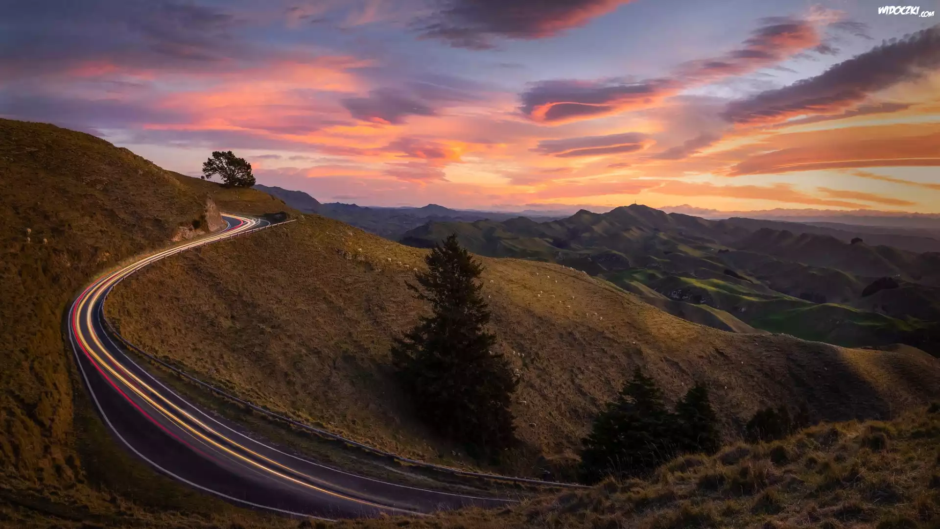 Zdjęcia, Droga, Zachód słońca, Góry, Wzgórza