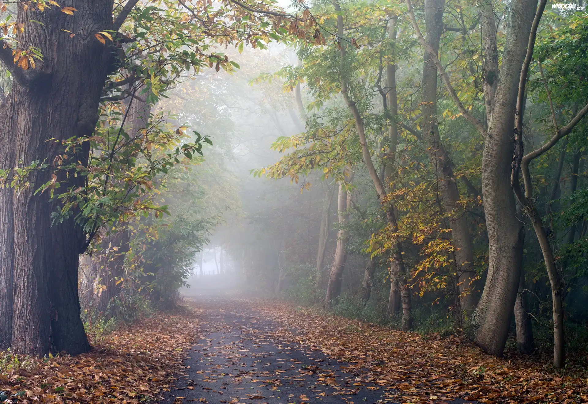 Zdjęcia, Droga, Drzewa, Jesień, Mgła