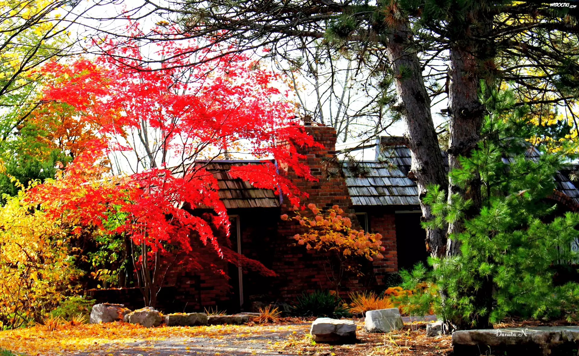 Zdjęcia, Jesień, Droga, Dom, Kamienie, Drzewa, Klon, Liście