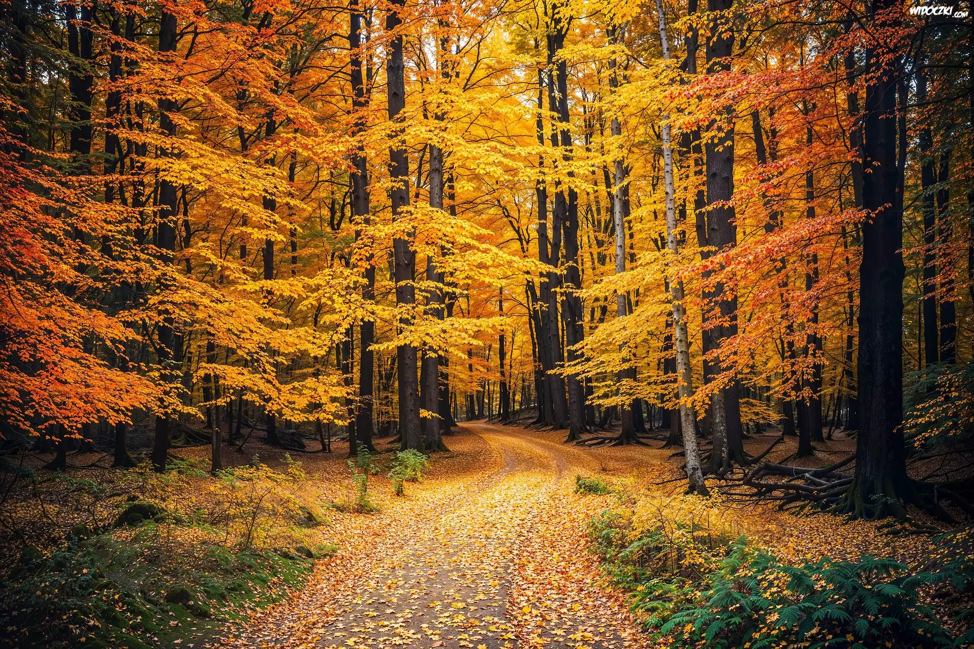 Zdjęcia, Las, Drzewa, Liście, Droga, Leśna, Jesień