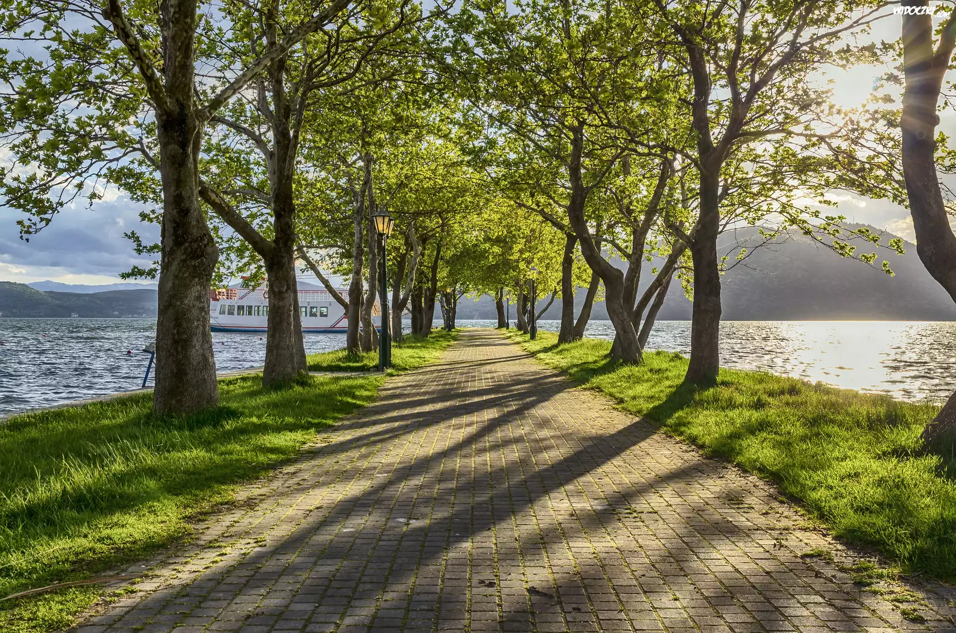 Zdjęcia, Zielone, Drzewa, Droga, Latarnie, Jezioro Kastoria, Statek, Zachód słońca, Kastoria, Grecja