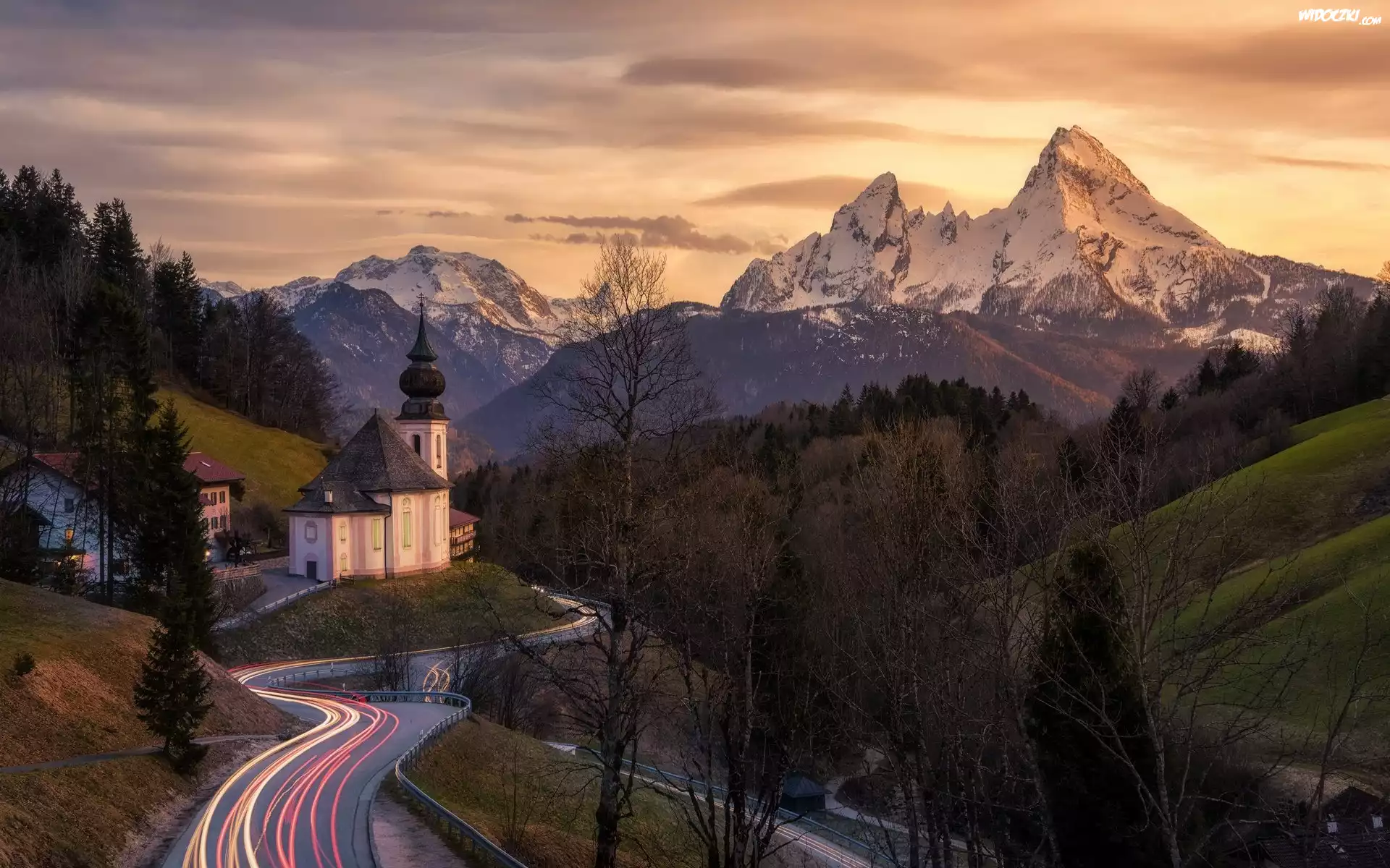 Kościół, Sanktuarium Maria Gern, Drzewa, Droga, Góry, Alpy Salzburskie, Berchtesgaden, Bawaria, Niemcy |