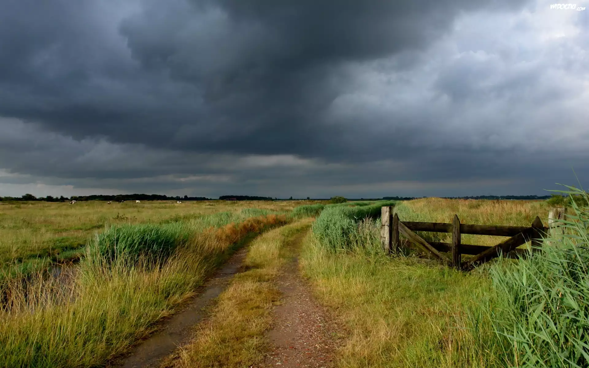 Zdjęcia, Łąka, Krowy, Zagroda, Droga, Chmury