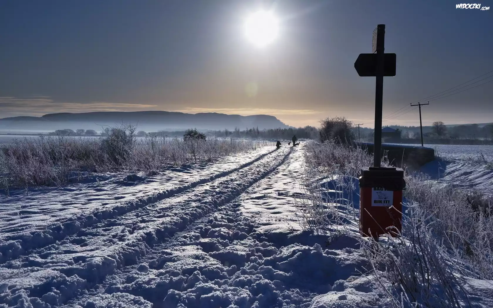 Zdjęcia, Droga, Śnieg, Krzewy, Słońce