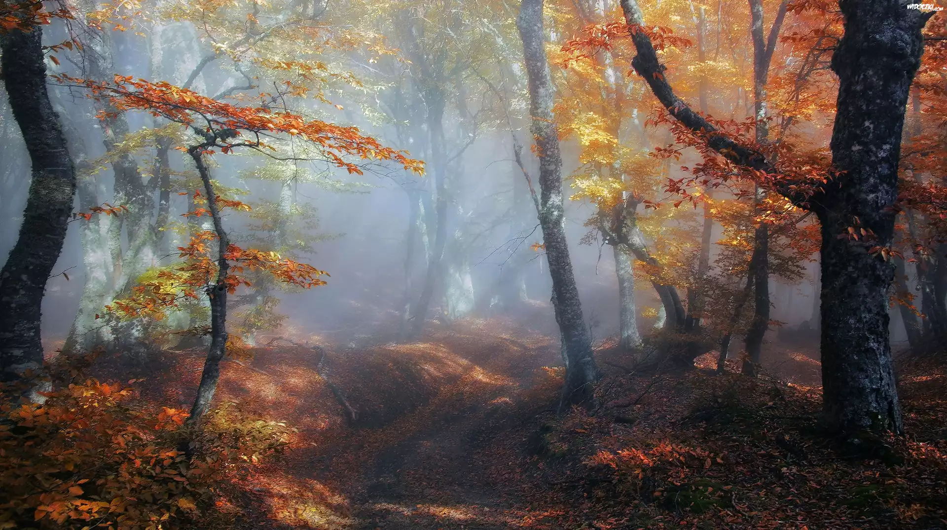 Zdjęcia, Las, Droga, Liście, Drzewa, Mgła, Świt, Jesień
