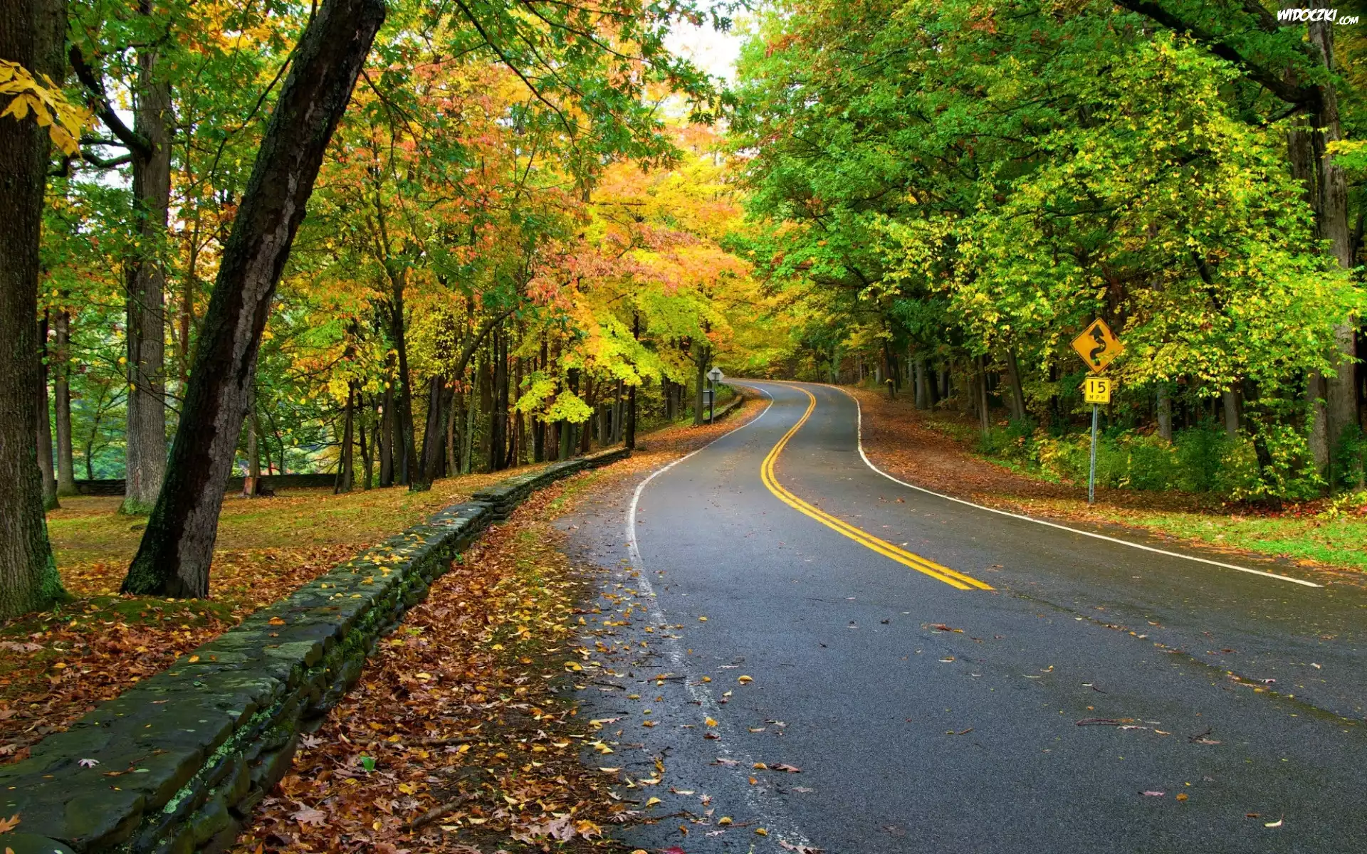 Zdjęcia, Droga, Las, Drzewa, Liście, Jesień