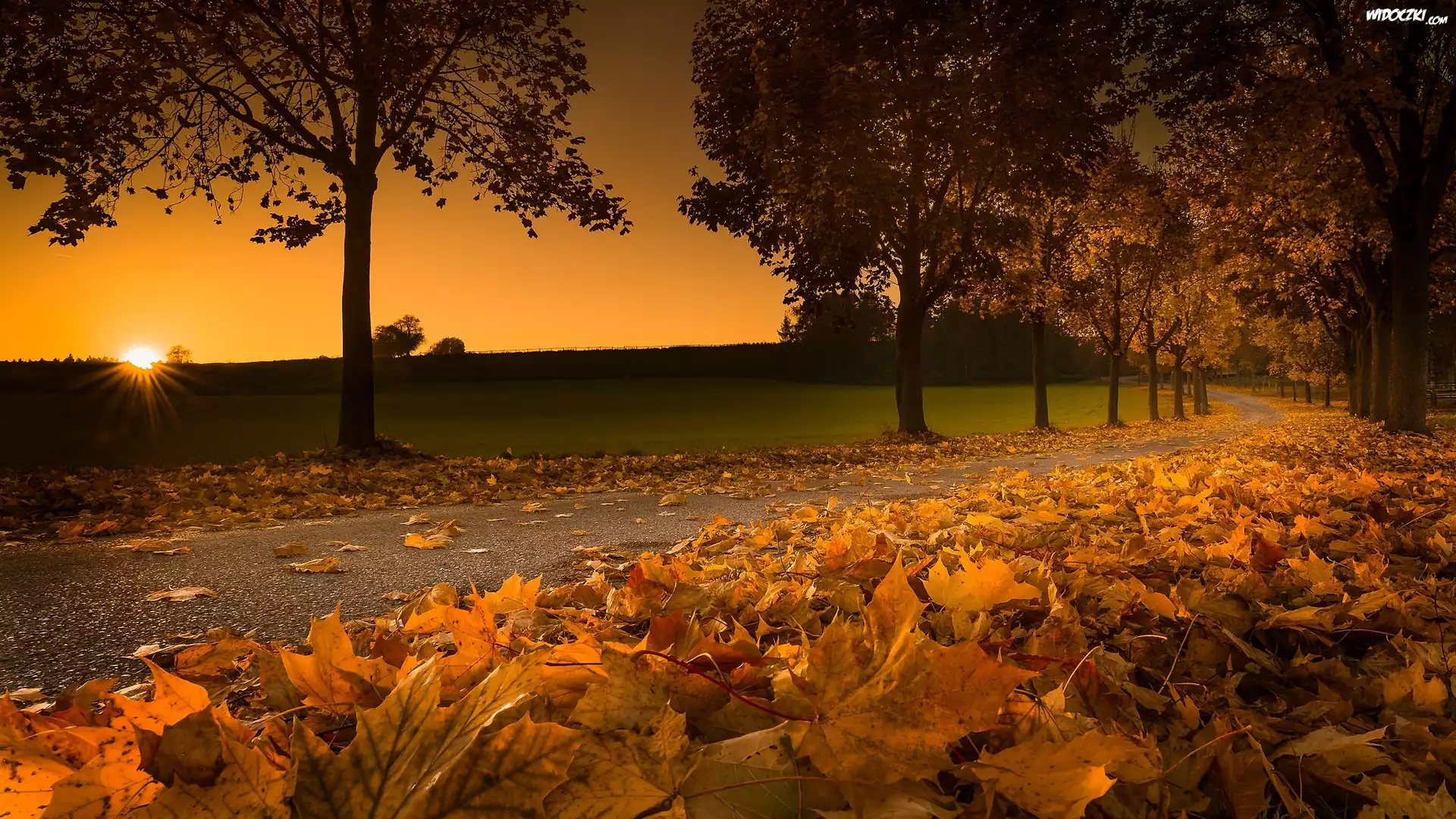 Zdjęcia, Droga, Drzewa, Zachód słońca, Liście, Jesień