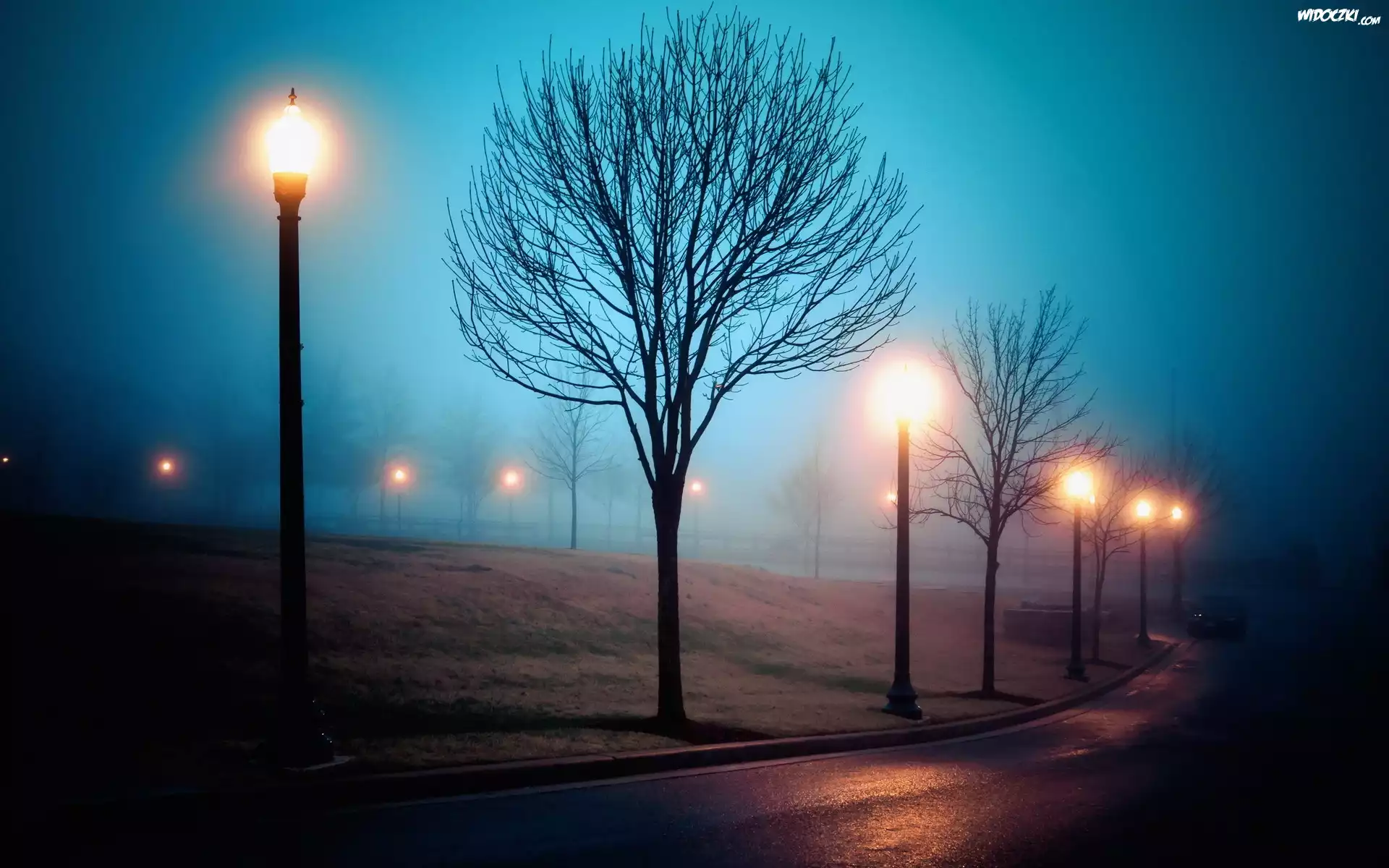 Zdjęcia, Droga, Samochód, Latarnie, Drzewa, Mgła, Jesień
