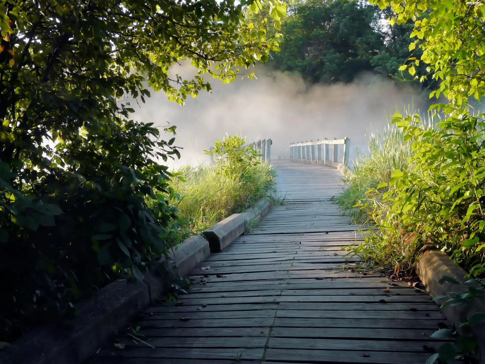 Zdjęcia, Droga, Drzewa, Mostek, Mgła, Poranek