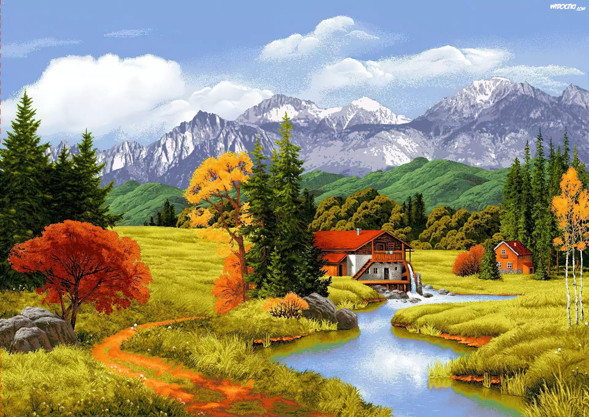 Zdjęcia, Droga, Łąka, Rzeka, Młyn, Góry