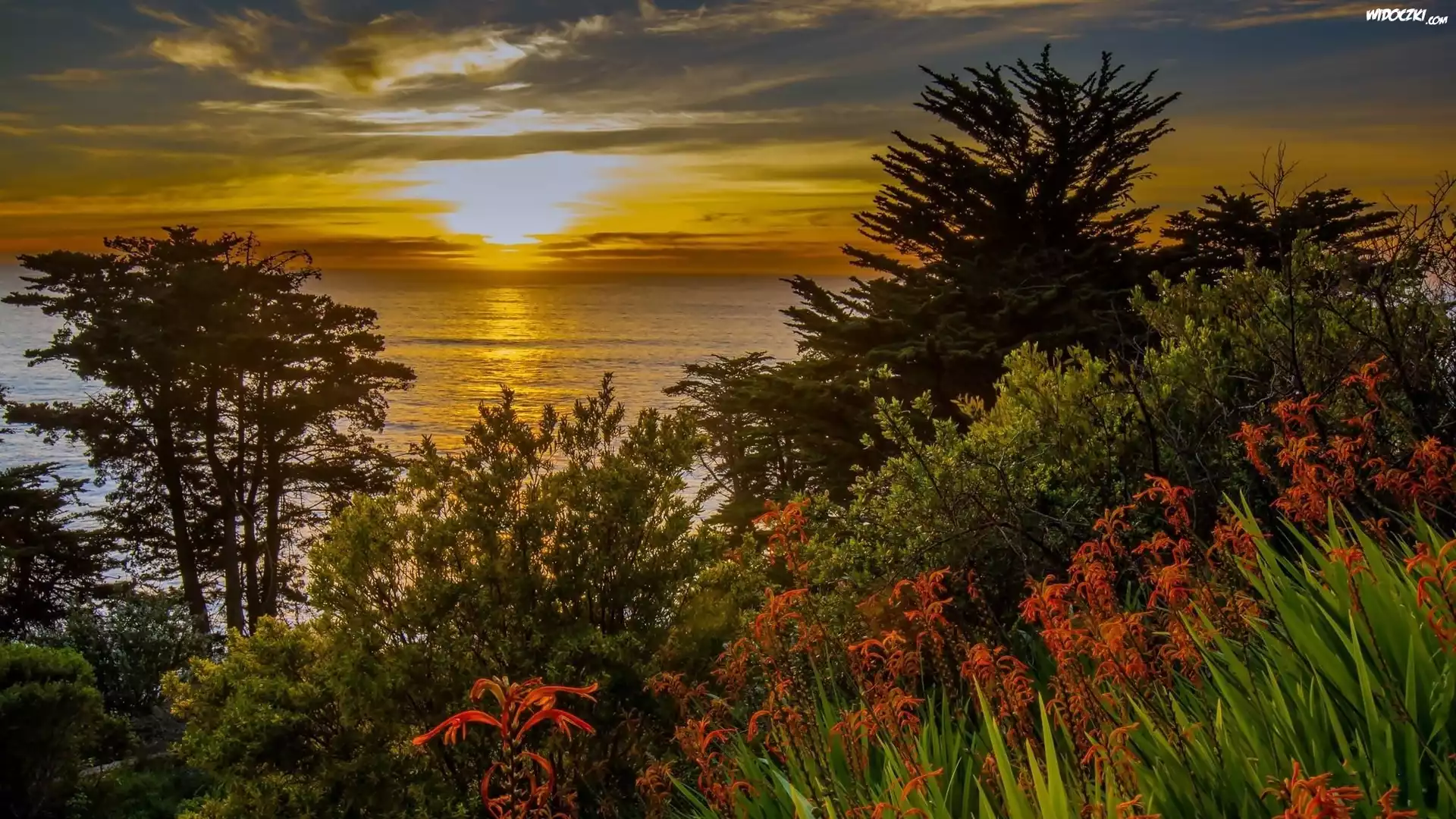 Morze, Droga, Góra, Drzewa, Kwiaty, Zachód, Słońca