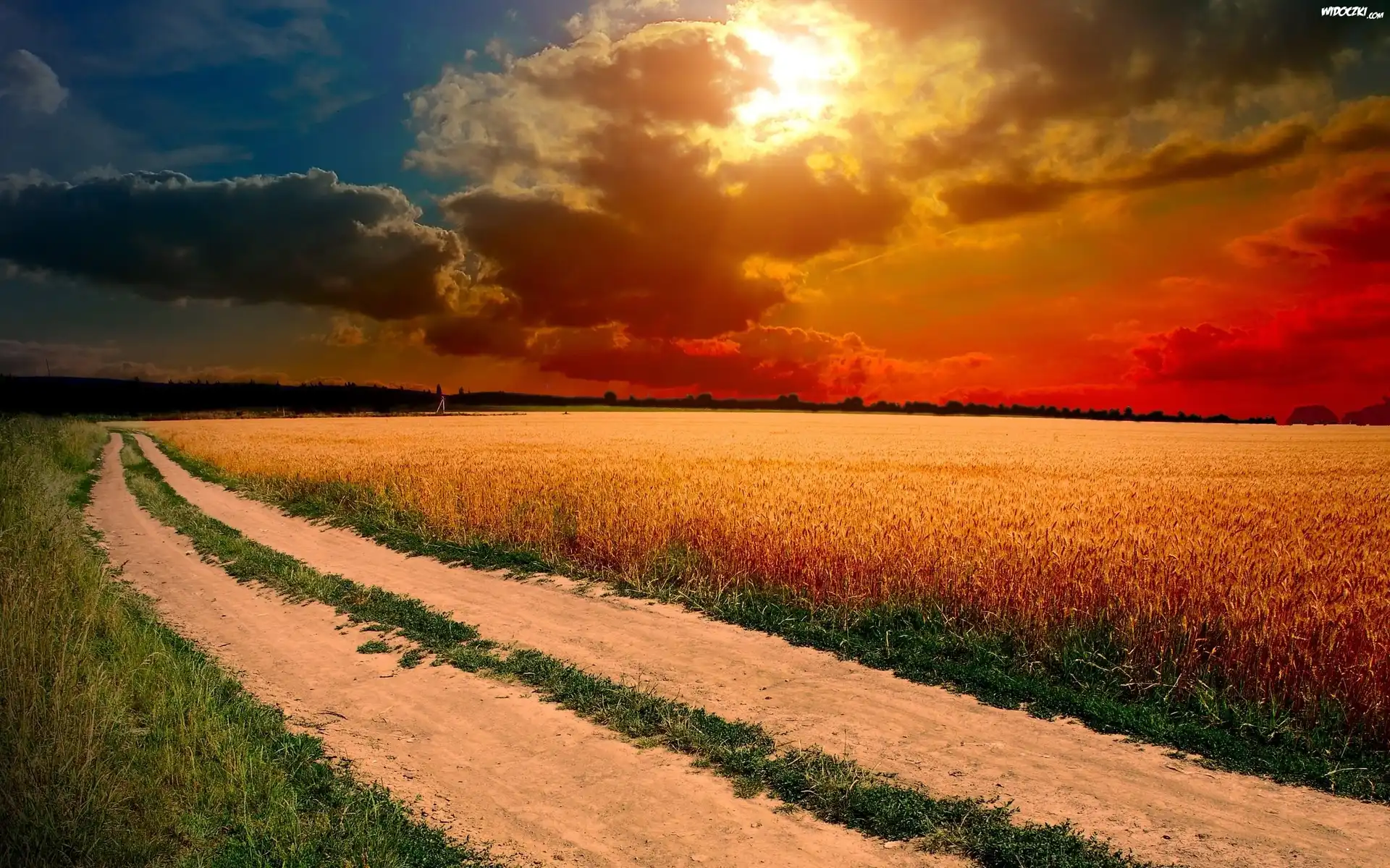 Droga, Pole, Zboża, Nadciągające, Chmury