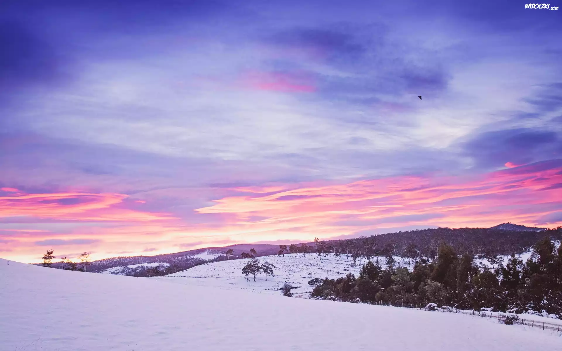 Zima, Zachód słońca, Chmury, Niebo, Pola, Wzgórza, Las, Drzewa, Droga