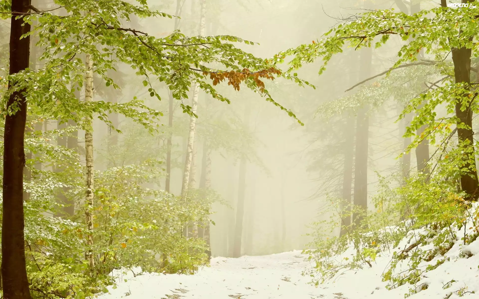 Zdjęcia, Droga, Drzewa, Śnieg, Mgła