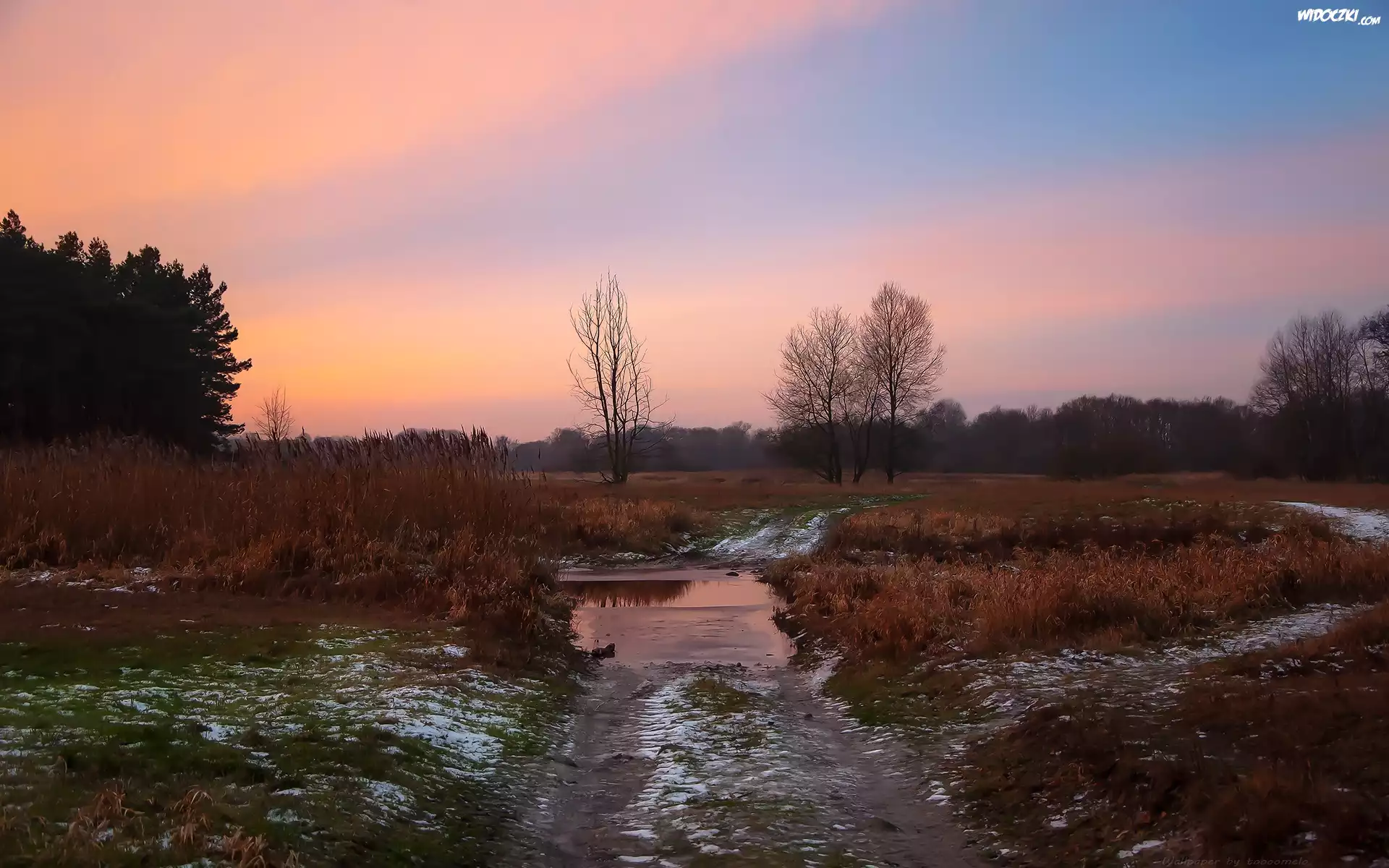 Droga, Ścieżka, Woda, Łąka, Śnieg.