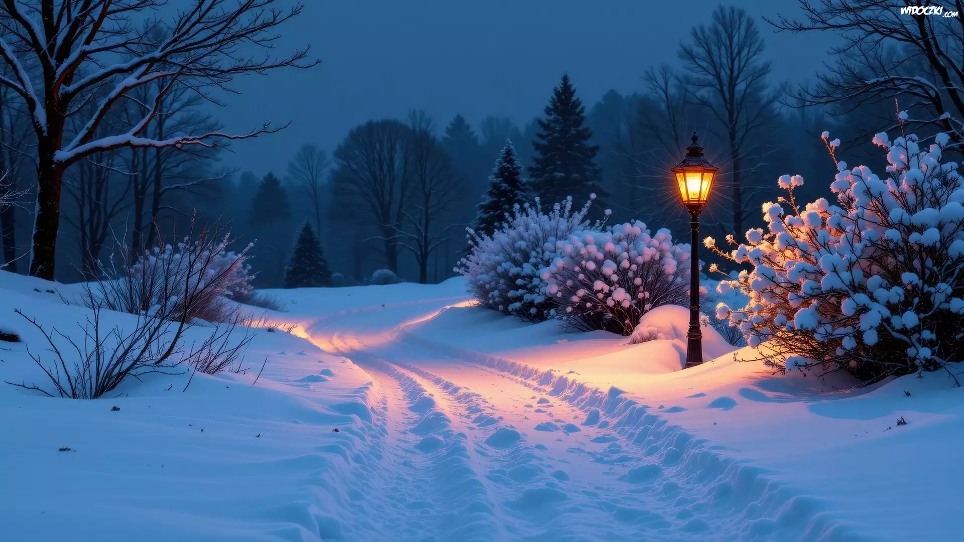 Zdjęcia, Zima, Noc, Ośnieżona, Droga, Krzewy, Drzewa, Latarnia