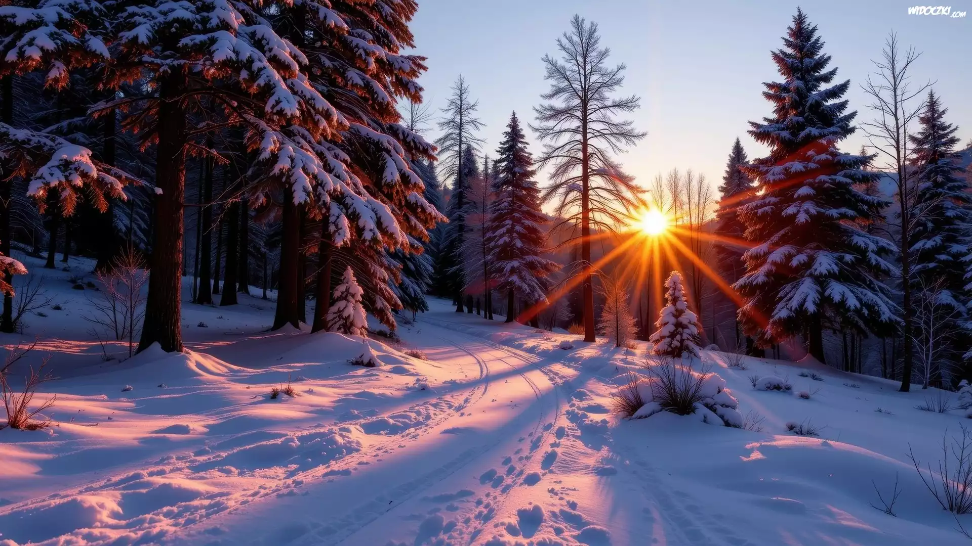 Zdjęcia, Zima, Las, Ośnieżone, Drzewa, Promienie słońca, Zaśnieżona, Droga