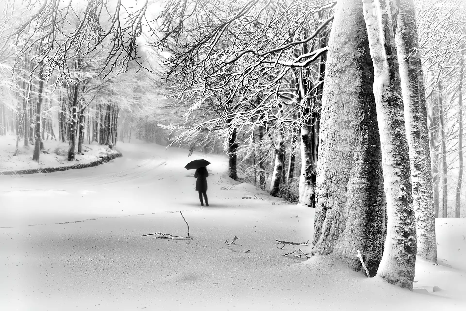 Zdjęcia, Droga, Drzewa, Śnieg, Postać, Parasol