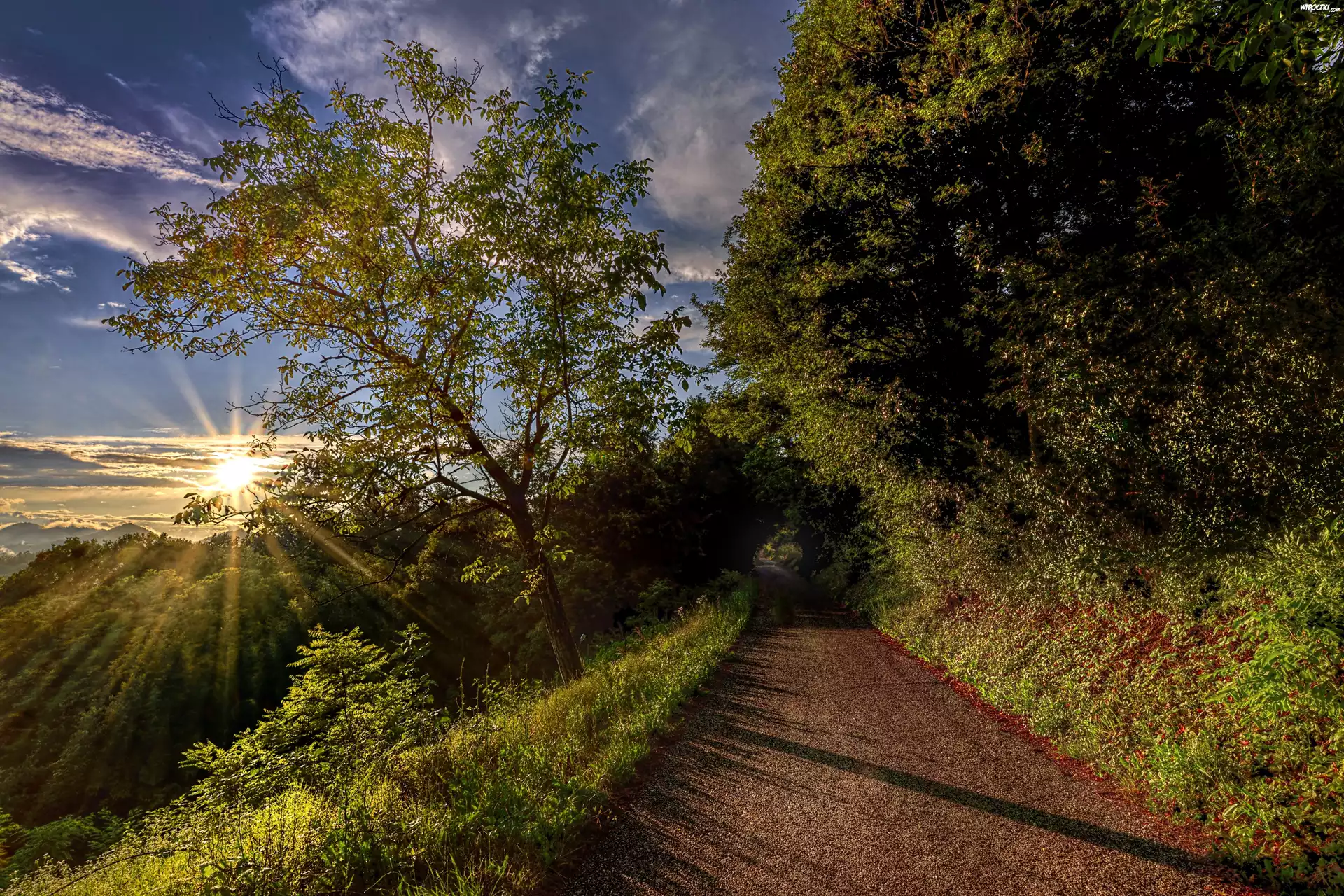 Droga, Drzewa, Chmury, Promienie, Słońca