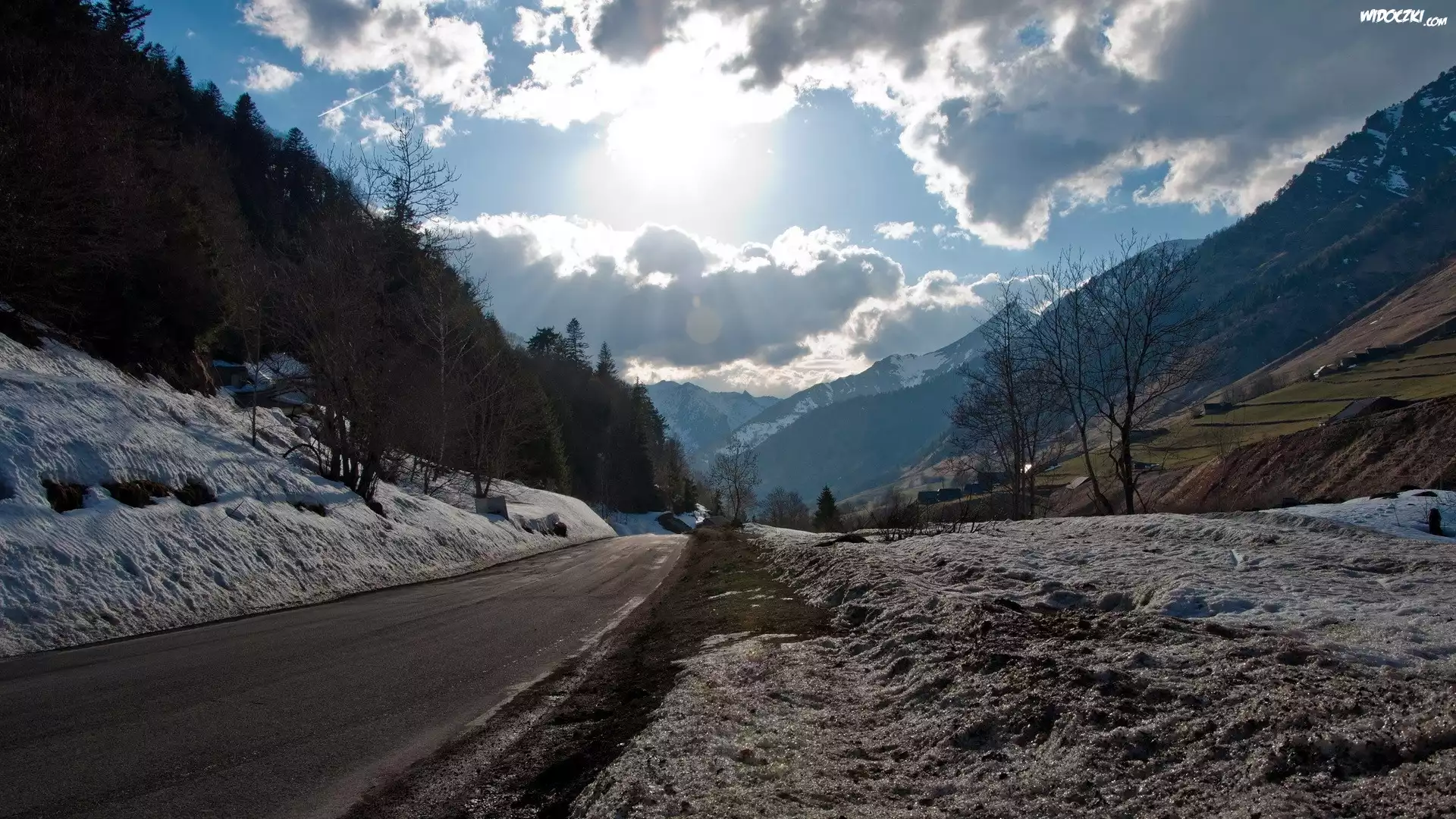 Zdjęcia, Droga, Śnieg, Góry, Promienie słońca