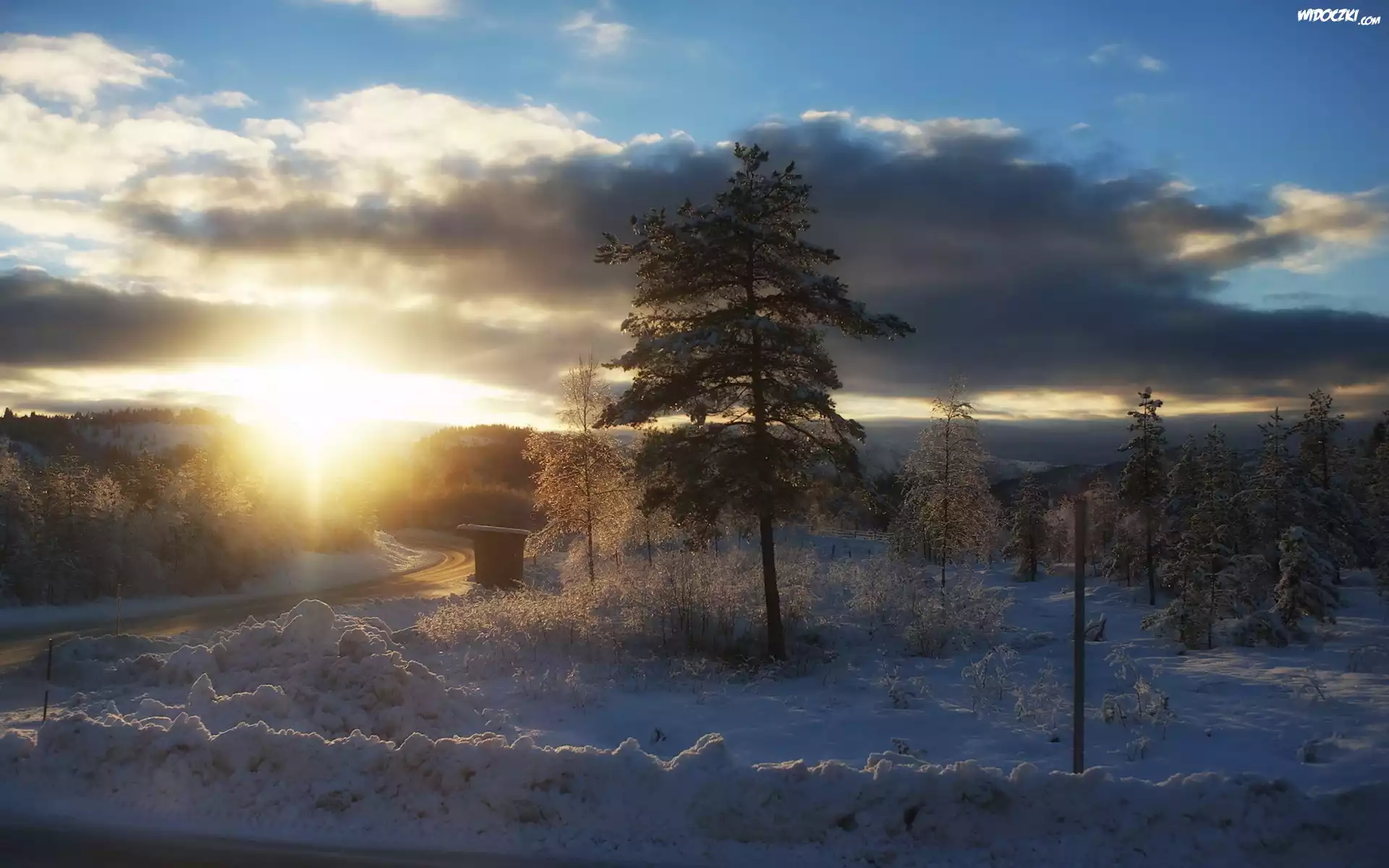 Zdjęcia, Droga, Chmury, Śnieg, Promienie słońca