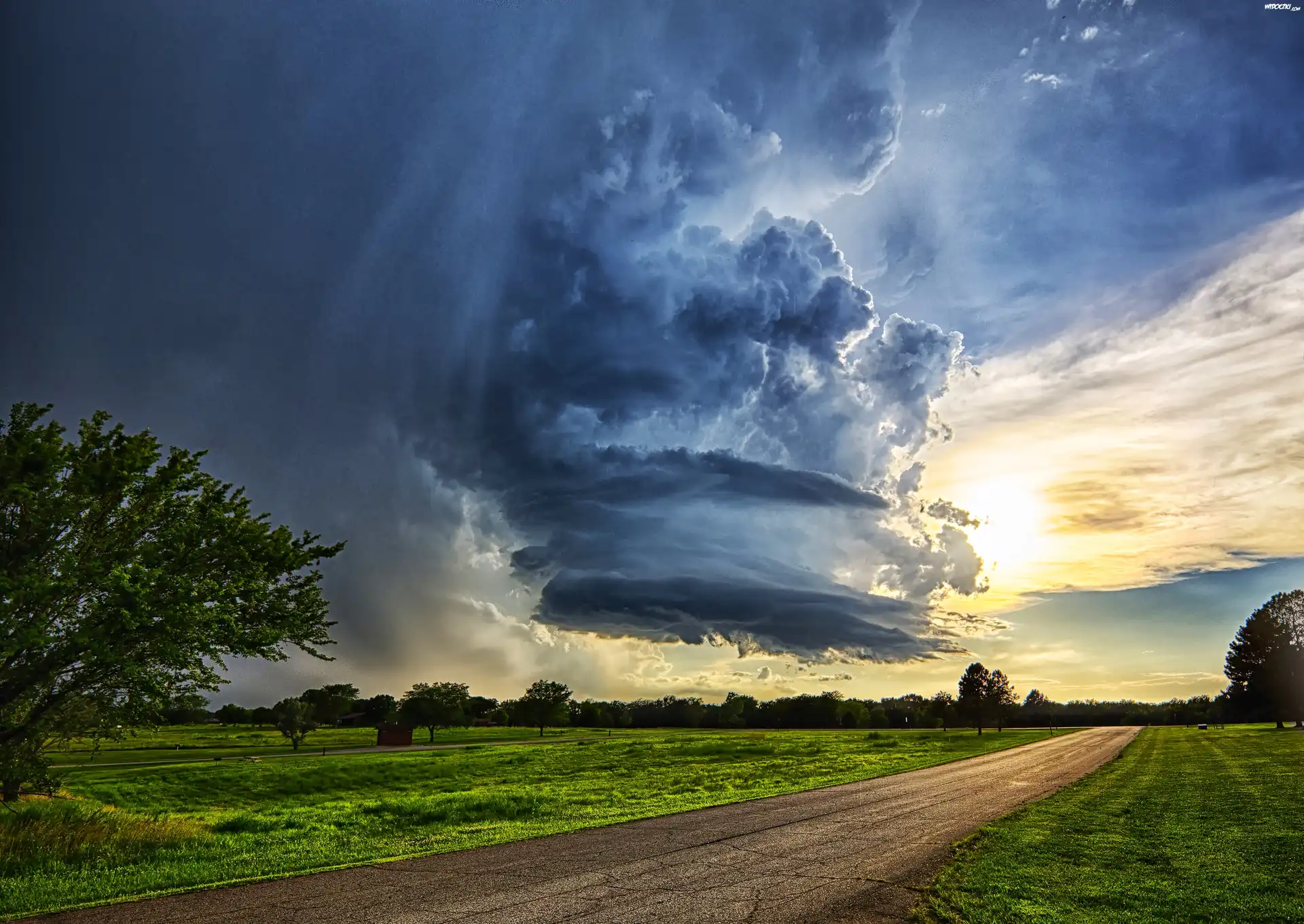 Droga, Pola, Chmury, Przebijające, Światło