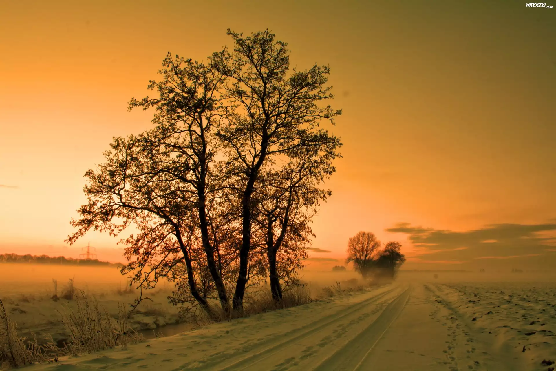 Droga, Pola, Drzewa, Zachód, Słońca, Zima