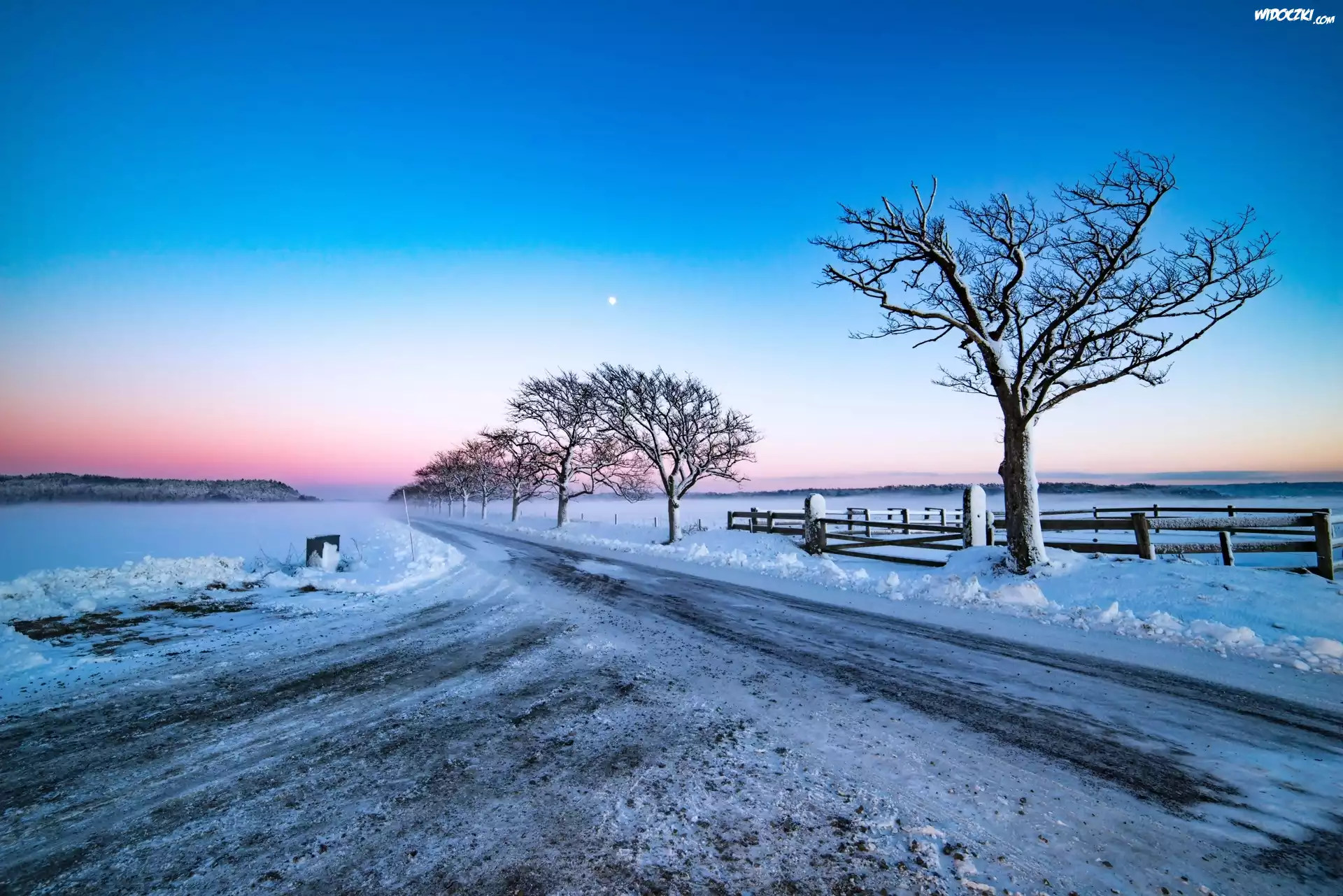 Zdjęcia, Droga, Drzewa, Wschód słońca, Zima