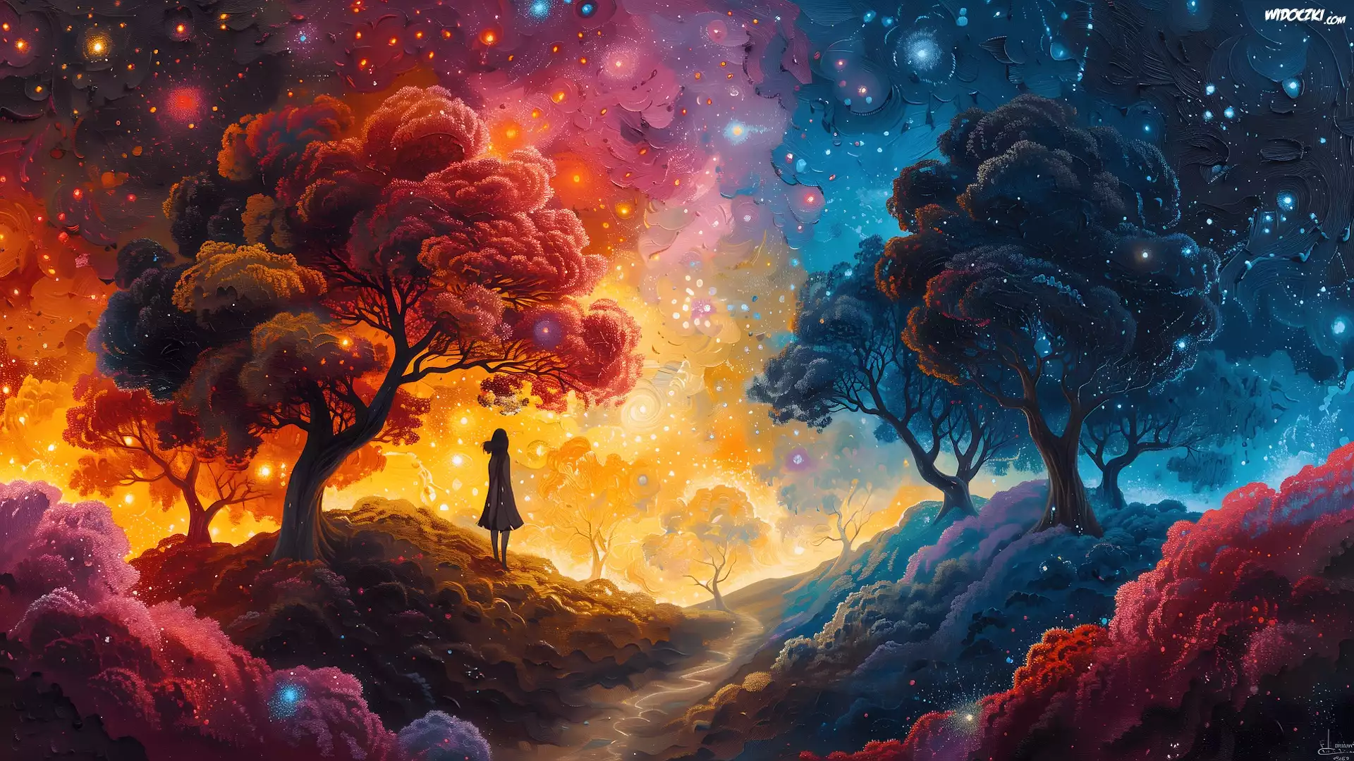 Grafika, Drzewa, Dziewczyna, Droga, Przebijające światło