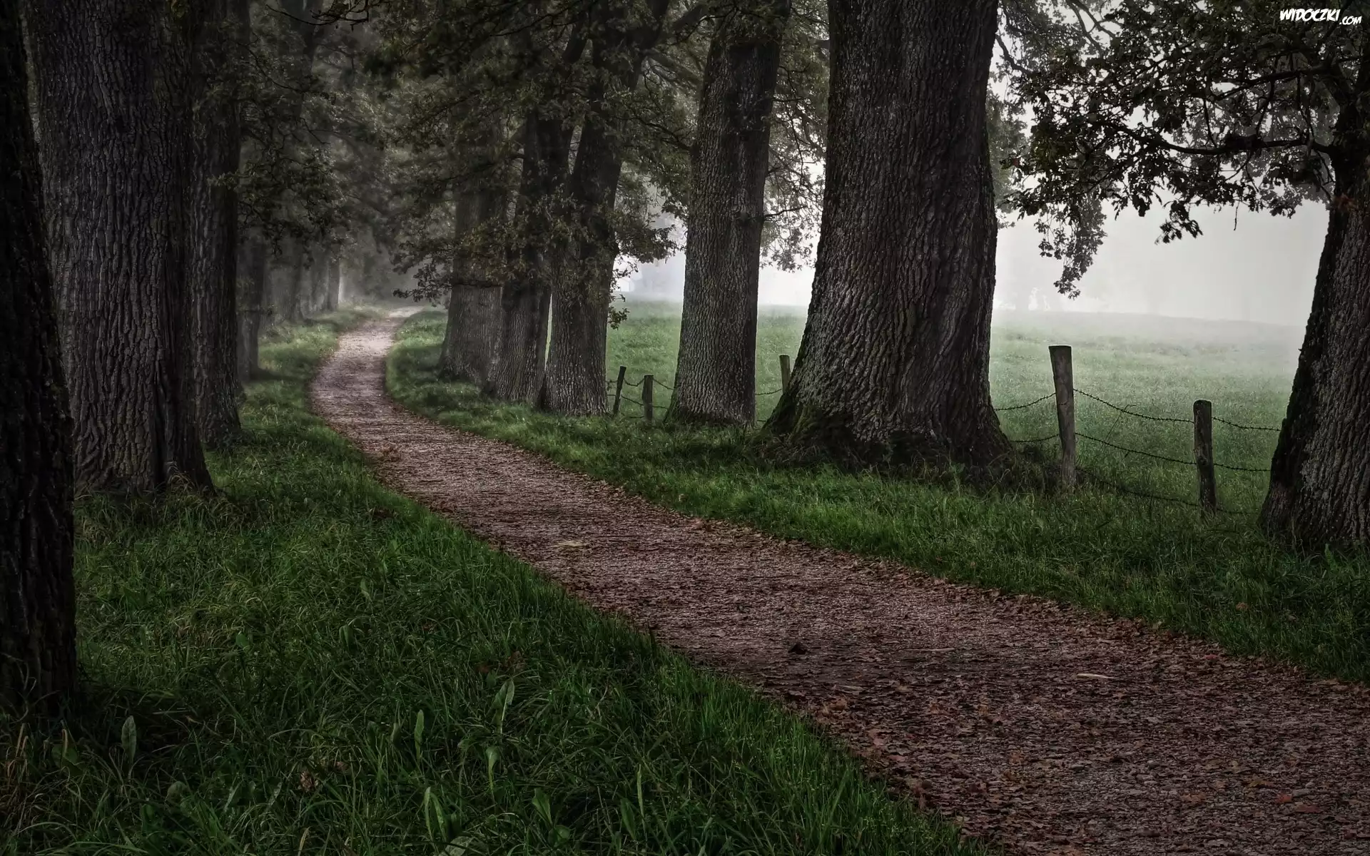 Zdjęcia, Droga, Drzewa, Trawa, Mgła