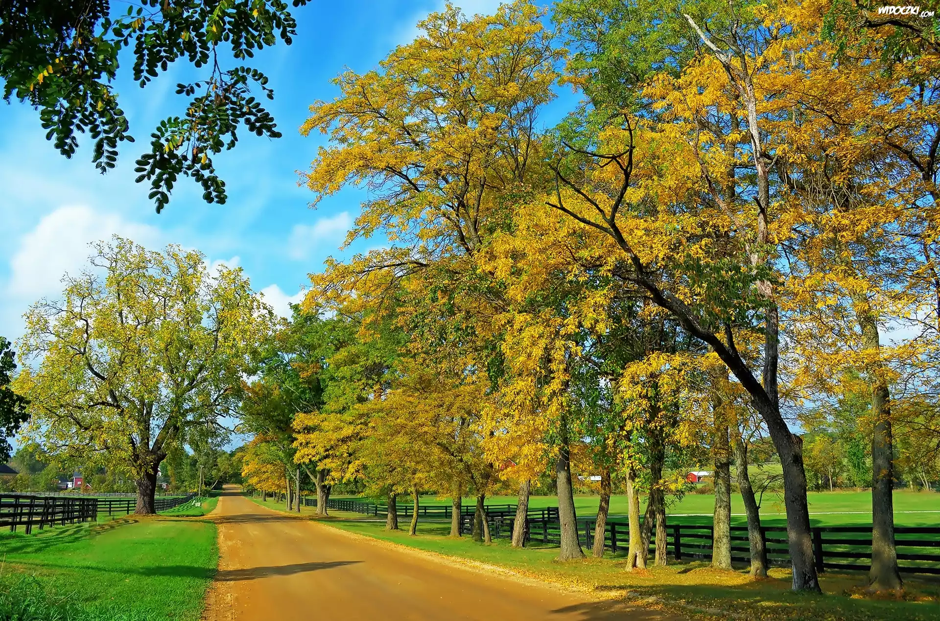 Zdjęcia, Droga, Drzewa, Trawa, Płot
