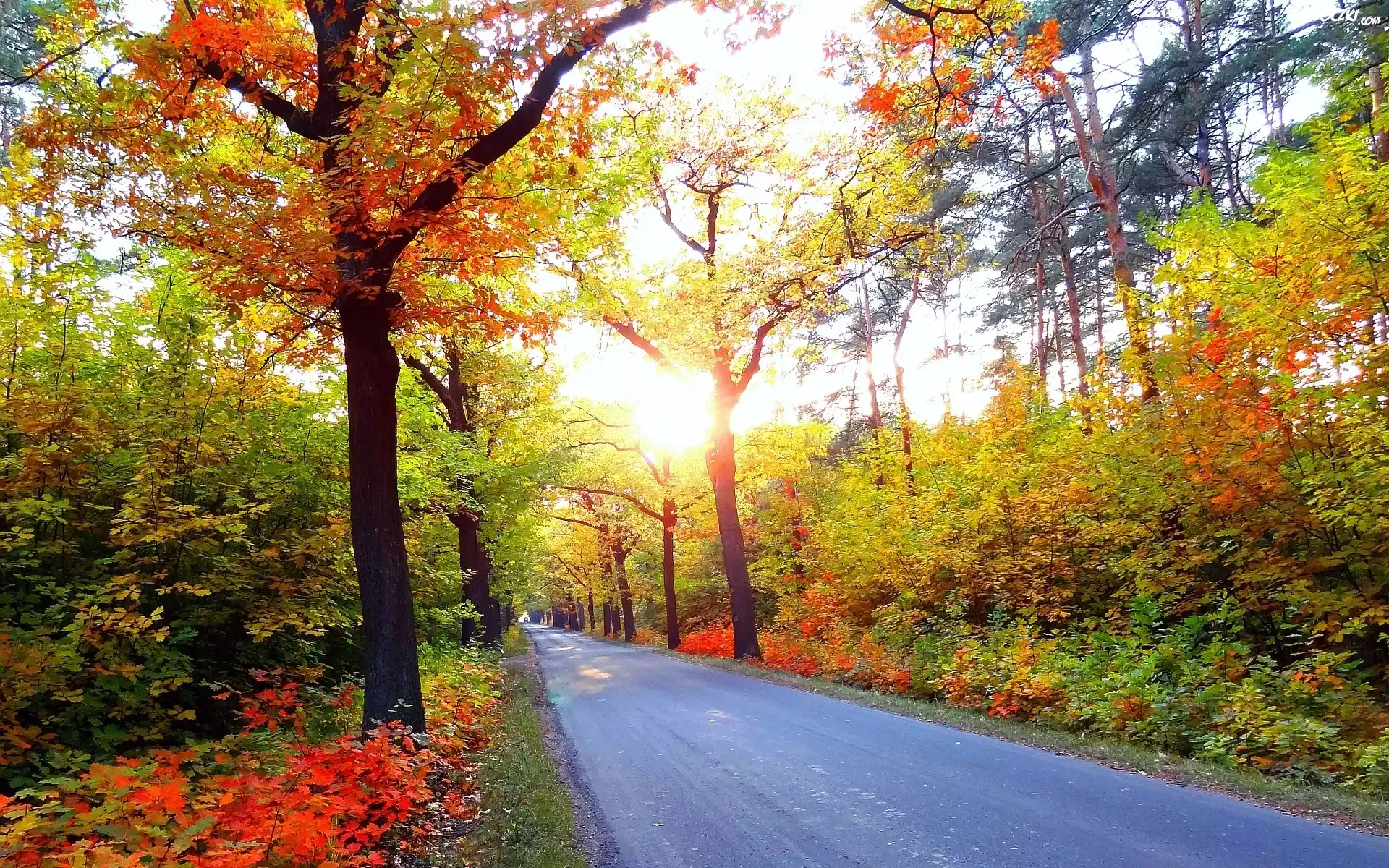 Zdjęcia, Droga, Kolorowe, Drzewa, Krzewy, Światło, Jesień