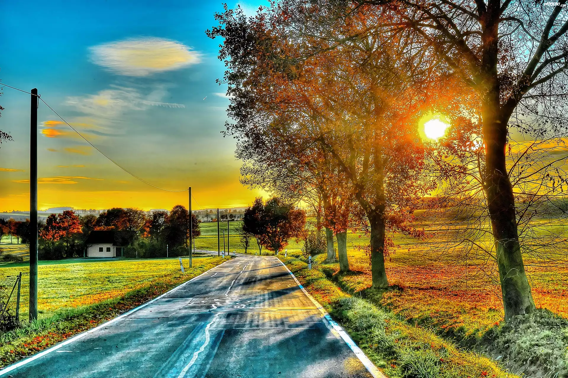 Zdjęcia, Droga, Dom, Drzewa, Wschód Słońca