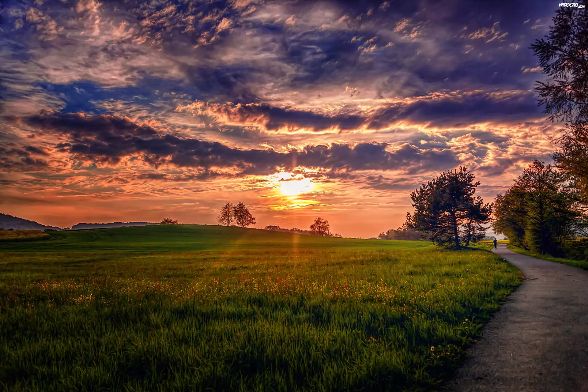 Zdjęcia, Droga, Łąka, Chmury, Zachód, Słońca
