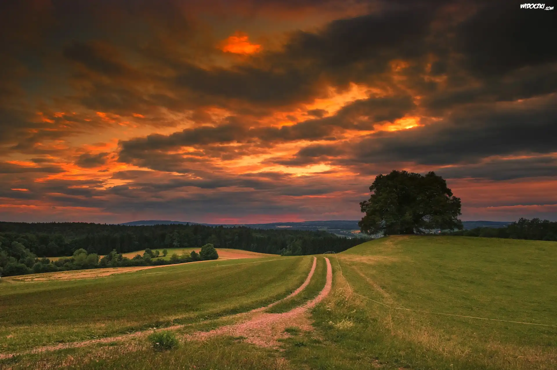 Zdjęcia, Droga, Łąki, Drzewa, Zachód słońca