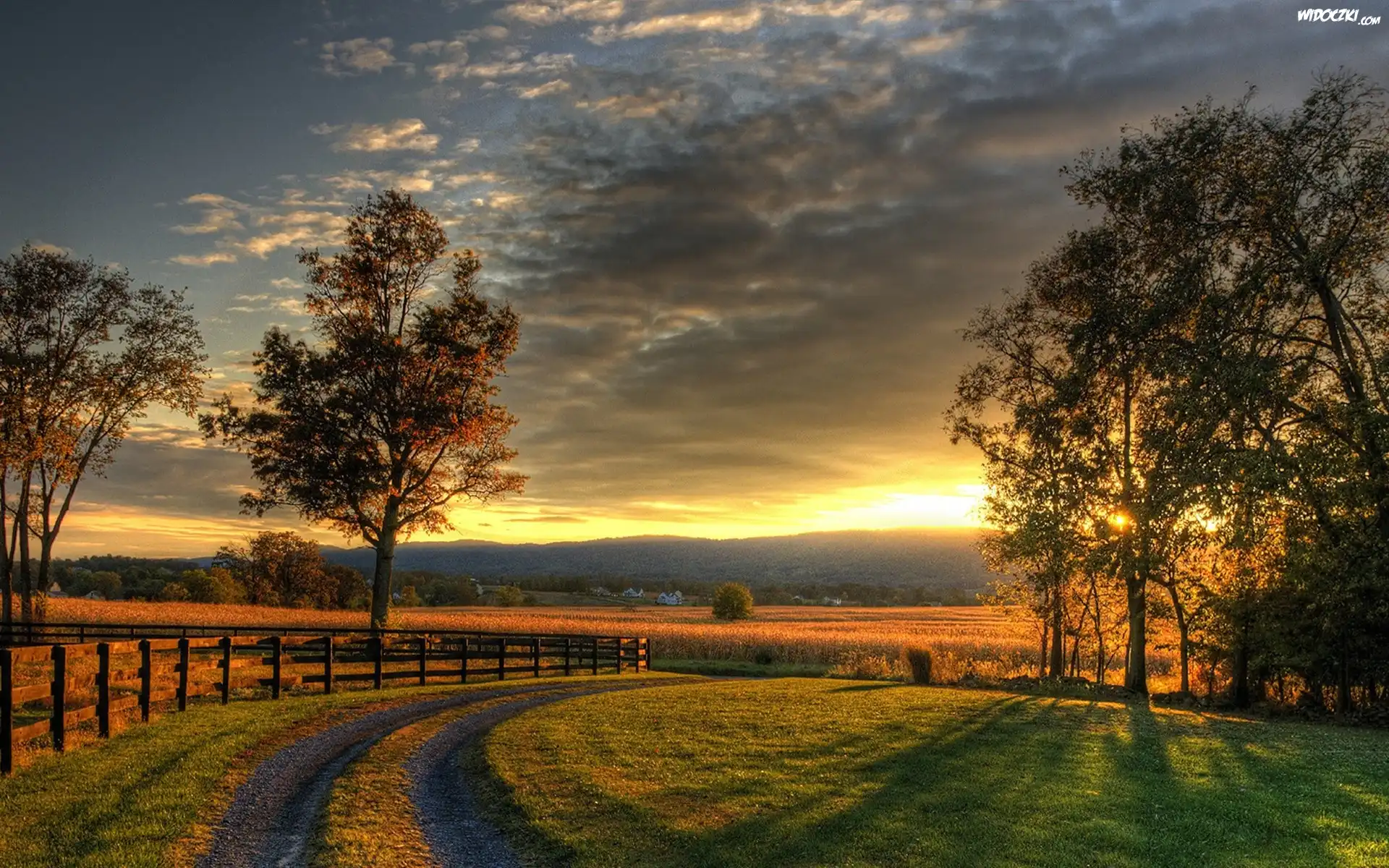 Zdjęcia, Droga, Ogrodzenie, Drzewa, Zachód Słońca