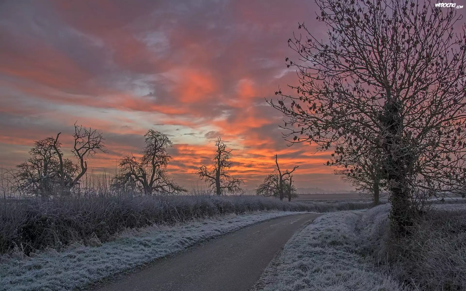 Zdjęcia, Droga, Drzewa, Krzewy, Szron, Zachód Słońca